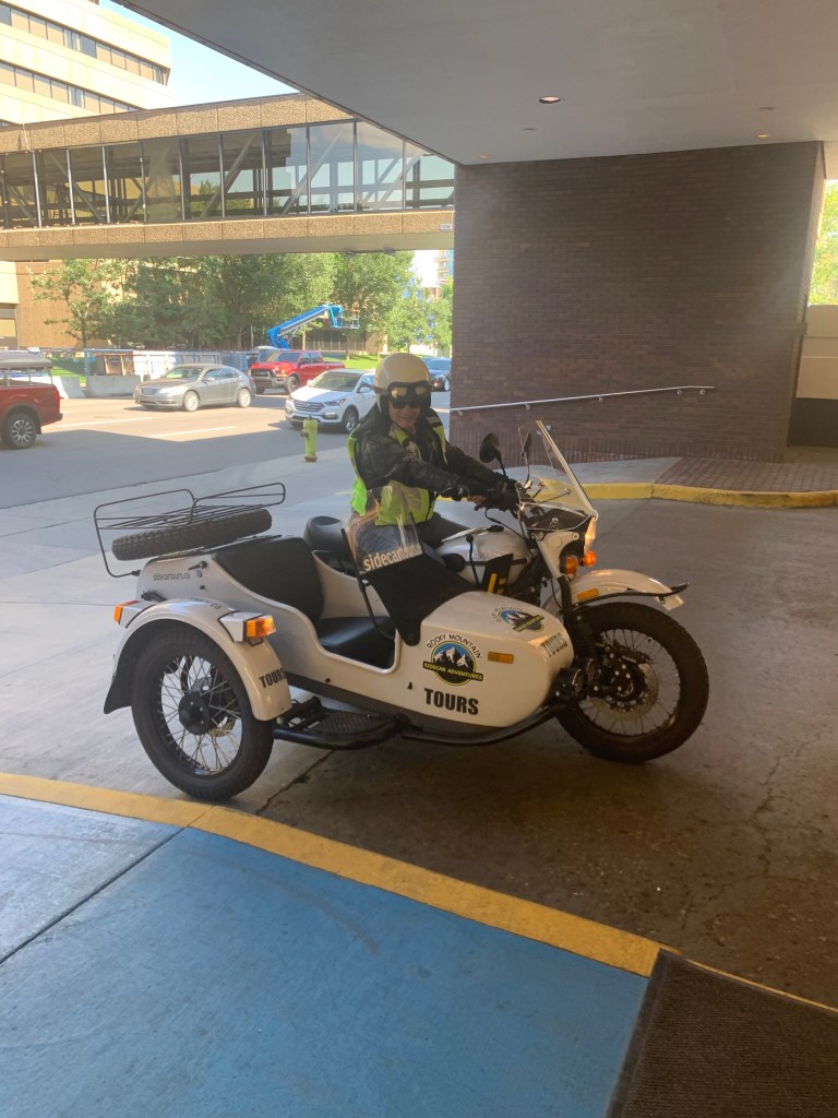 The next day before our official check-in for our Globus bus tour, we booked a city tour with Rocky Mountain Sidecar Adventures. I was disappointed I wasn’t able to drive the motorcycle, but still had a great time. Rose and I each had our own personal driver while we sat in sidecars being escorted through the city by Warren and Brian. We caught a lot of attention from people in Calgary waving and pointing as we rolled through the various city neighborhoods. Warren and Brian stopped a few times to point out significant sites, talk about the city they loved, and so we could take photos. Later, we learned some of the people on our bus tour had taken photos of us leaving the hotel. They were disappointed they didn’t book it themselves. I highly recommend it for anyone visiting Calgary. Warren and his wife Nicole own this small business, and we are always eager to support entrepreneurs. They have twenty-two drivers for 6 restored Russian Ural motorcycles. If you visit, check them out and take a tour. You can find them online at https://www.rockymountainsidecar.com/ or on sites like TripAdvisor and Viator.