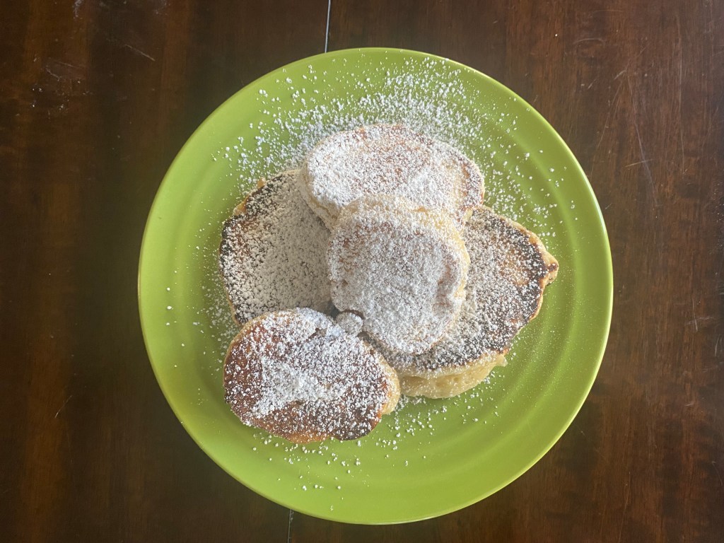 Once bubbles start to pop on top (1-2 minutes), flip your poffertjes.